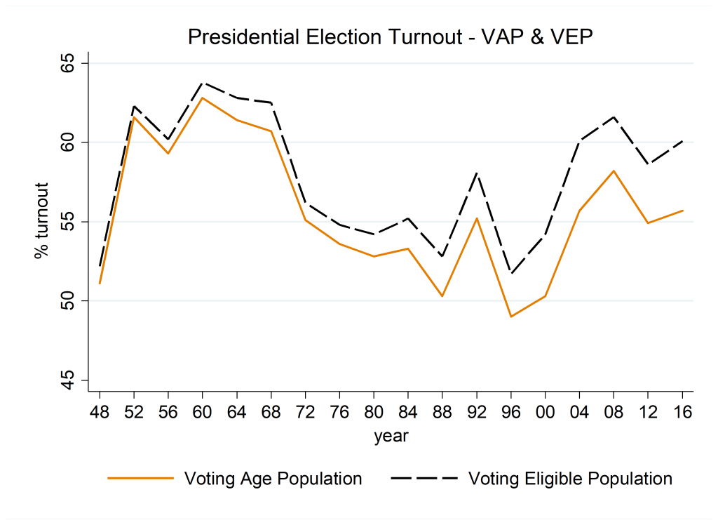 The disparities between VAP and VEP in fact grow larger over the years – the number of ineligibles rose dramatically in the 1980s, 1990s and into 2000s. Since 2000, the average VEP is just over 60%, approaching levels not seen since the 1960s.
