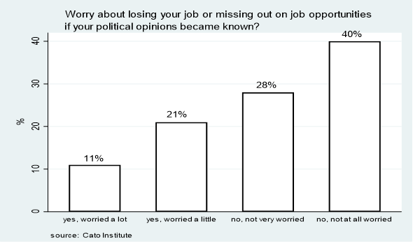 The data presented here and in the last post are unique. Few opinion surveys ask people to consider the political climate or assess the personal risks associated with political expression. Elisabeth Noelle-Neumann would have been pleased to know her vision of public opinion as our “social skin” remains alive and well.