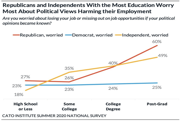 - News Media: In general, educated people follow political news more so than less educated. Republican news outlets are quick to spotlight cases of employment termination or career threat due to conservative political expression. Because educated Republicans and Democrats follow different news media, they may not share the same concerns about their employment.