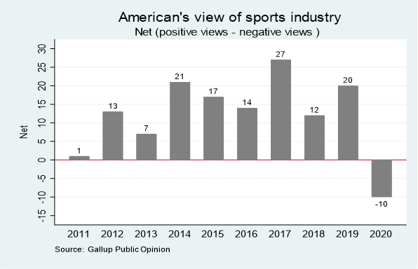 In part 1 of this post, I outlined the costs and benefits of sports activism.  In part 2, I examine data about American’s image of the sport industry.  For the last 2 decades, the sports industry has enjoyed a consistently favorable image.  However, in 2020 that image turned decidedly negative.