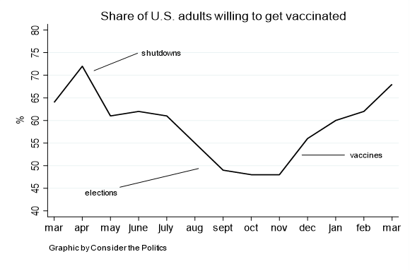 The people follow their leaders. During the presidential election, the overall share of Americans that were very concerned about the outbreak dropped — as did the share willing to get a vaccine. In fact, from September to Election Day, less than 50% of Americans expressed a willingness to get a vaccine. In five short months, receptivity to a COVID vaccine dropped over 20 points!