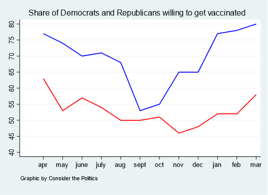 With Biden’s victory, Democrat’s willingness to get vaccinated shot up to 65%. By March 2021, 80% of Democrats agreed to vaccinate. Republicans’ willingness slowly increased as well but has yet to surpass the high mark set last April.
