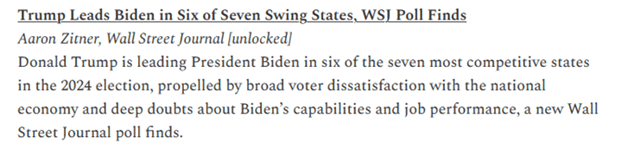 To make matters worse, WSJ provided reasons why Trump was ahead – voter dissatisfaction about the economy and public doubts about Biden’s capacity to perform as president.