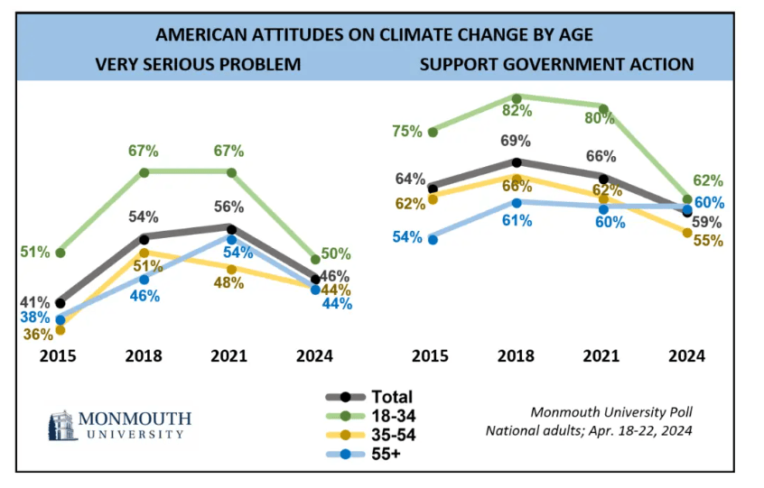 The shift appears most evident among 18-34 year olds. The percentage that see climate change as a very serious problem has dropped by 17 points in the past 3 years.
